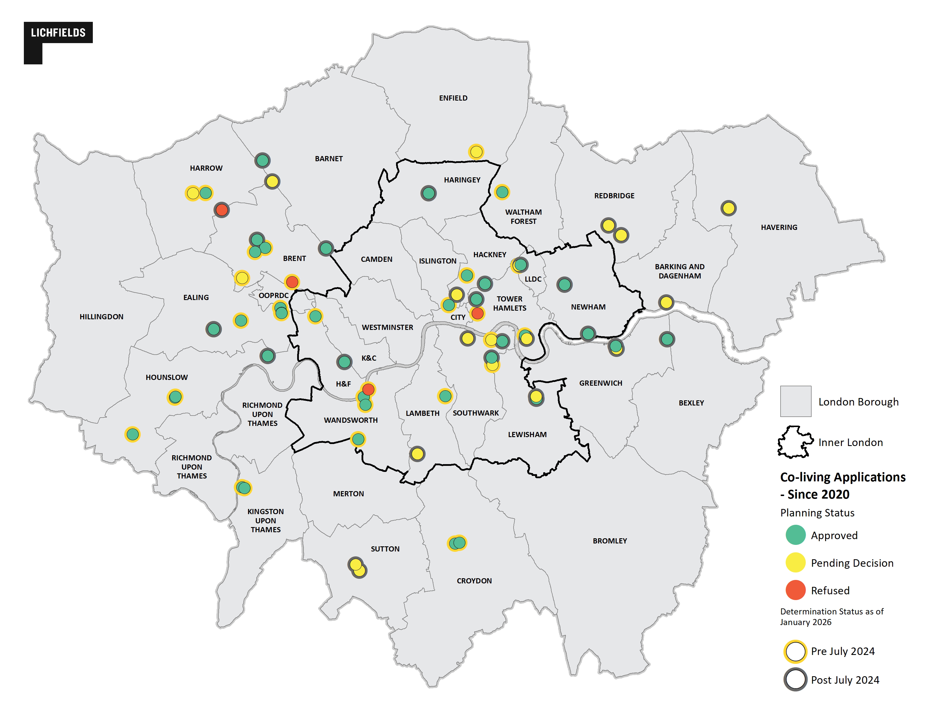This update covers co-living schemes of over 30 units in London with a planning application submitted between 1st July 2024 and 9th January 2026